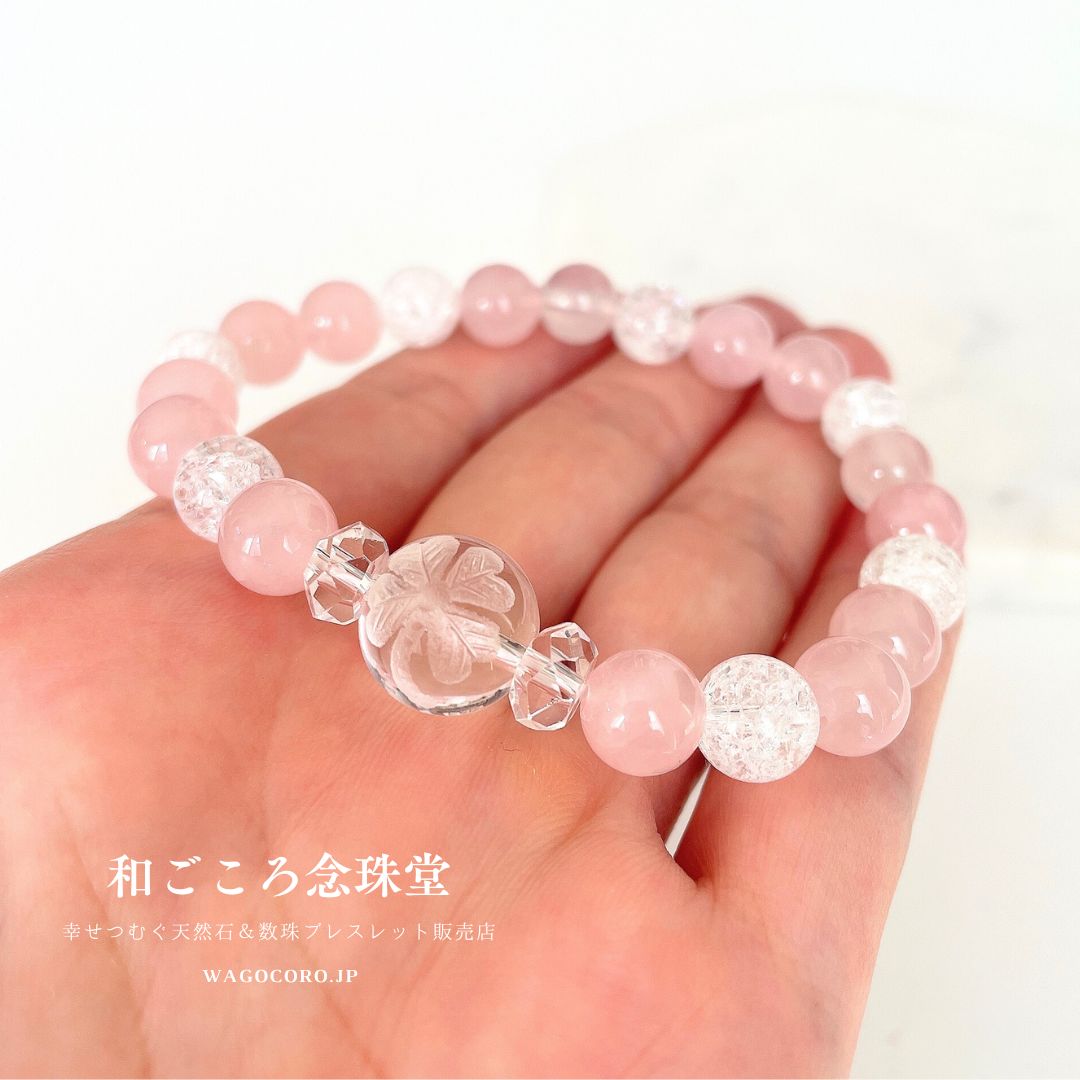 水晶四葉のクローバー彫り×ローズクォーツ×クラック水晶を使用したブレスレットです。